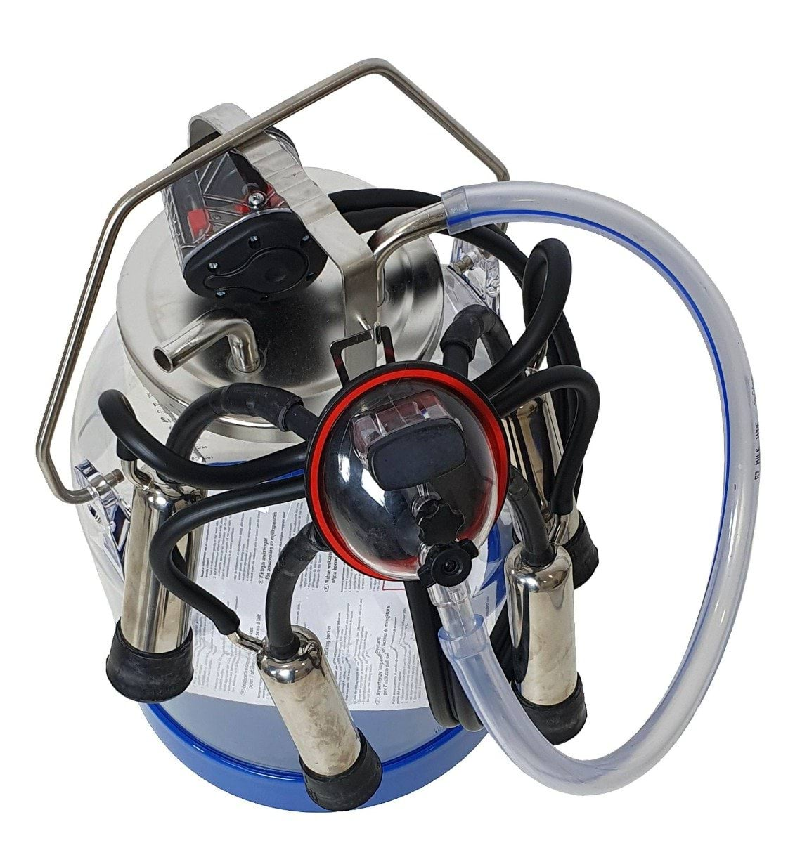 Bańka udojowa z tworzywa sztucznego z aparatem udojowym dla krów to wyposażenie hodowlane dla bydła mlecznego i mięsnego nr kat. 01-6064. Profesjonalne akcesoria hodowlane usprawniają codzienną obsługę stada i poprawiają dobrostan zwierząt.
