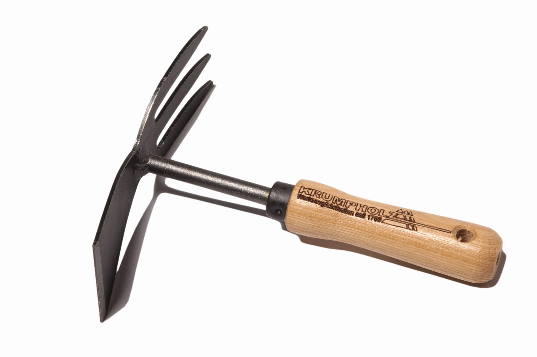 Motyczka 2-stronna kuta, ręcznie wykonana przez Krumpholz ze stali narzędziowej i styliska jesionowego. Przeznaczona do pielenia, spulchniania i uprawy gleby. Nr kat. KRUMP_1476.