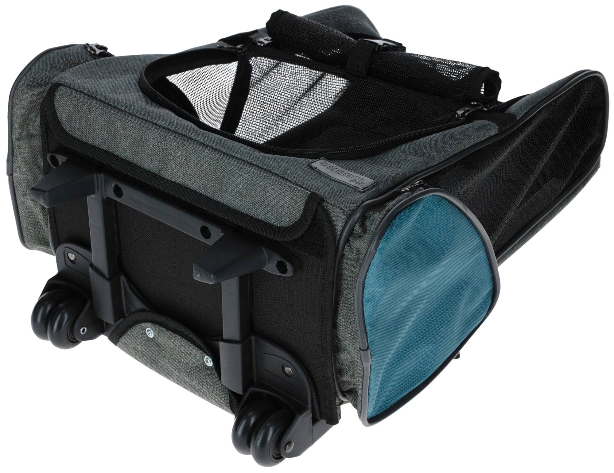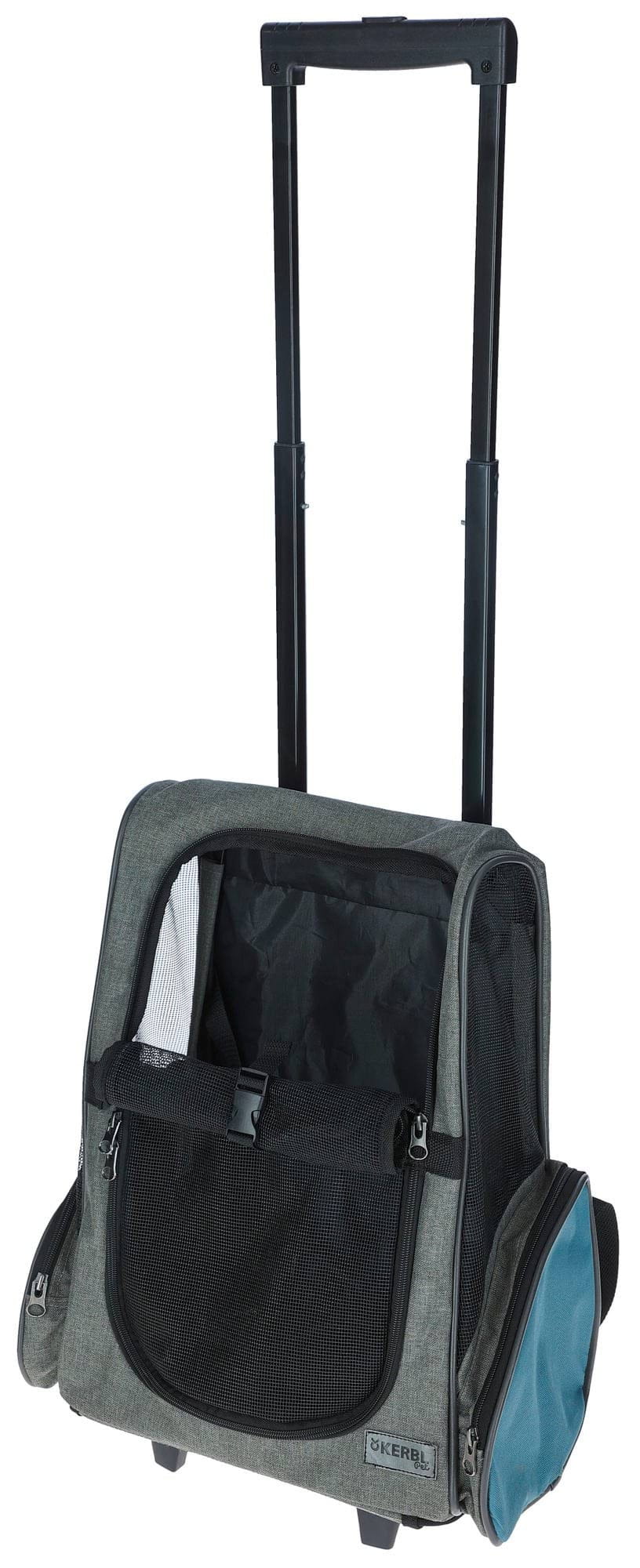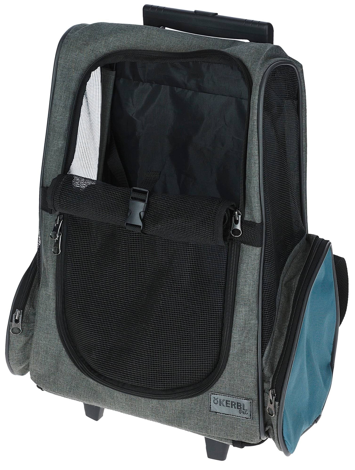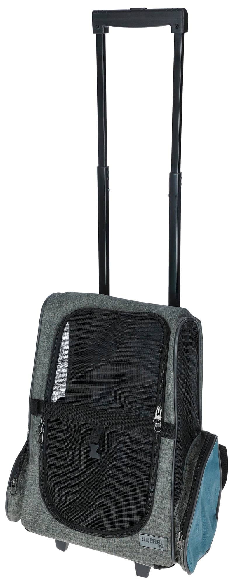 Torba podróżna na kółkach dla psa Vacation, 41 x 26 x 55 x 103 cm, szaro/niebieska, Kerbl to torba transportowa lub klatka dla psa nr kat. 80570. Zapewnia bezpieczny i wygodny transport podczas wizyt u weterynarza, podróży i wyjazdów.