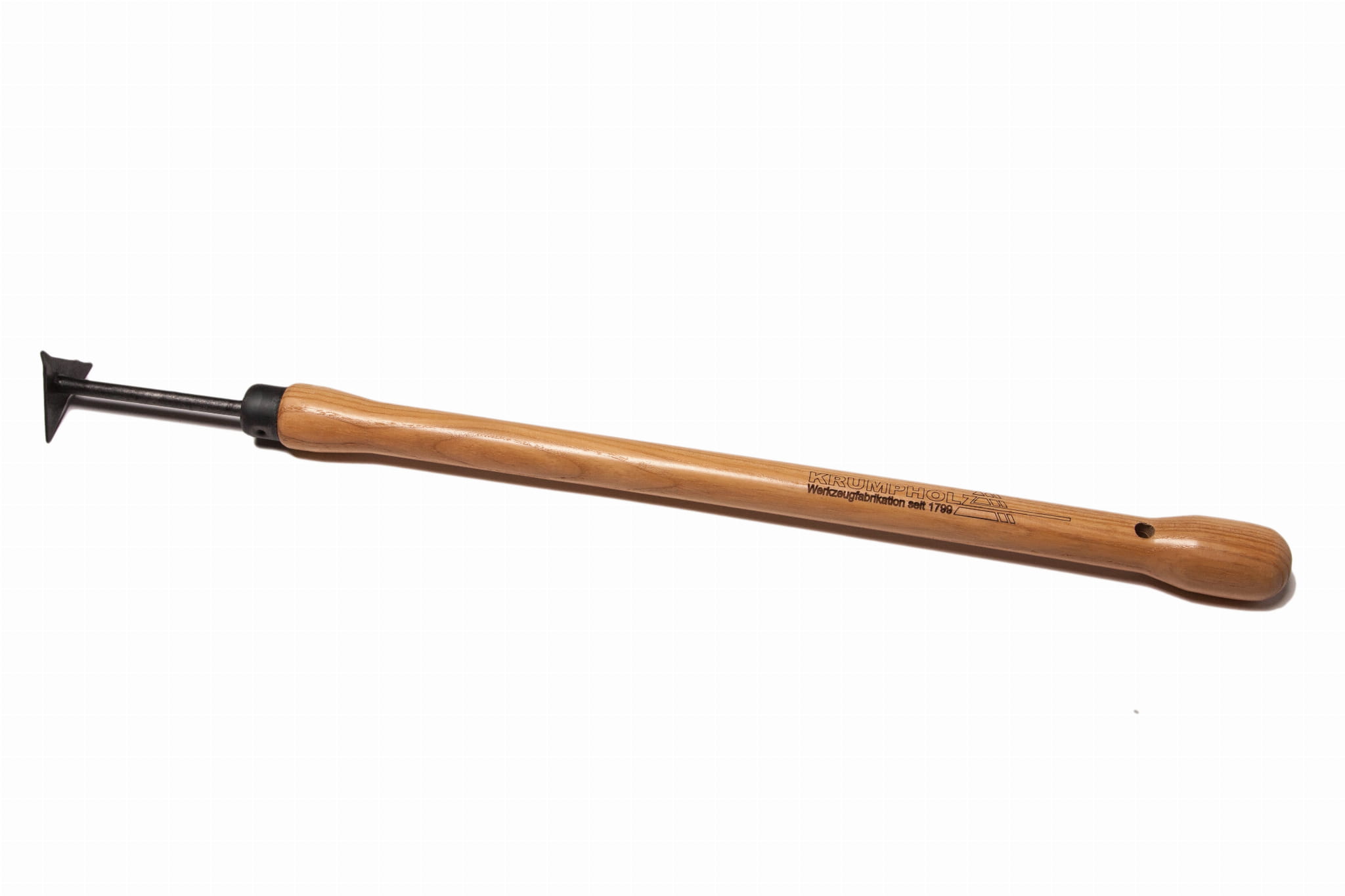 Skrobak do fug ze styliskiem jesionowym 48 cm. Przeznaczony do usuwania chwastów i mchu z fug brukowych, tarasów i chodników. Krumpholz — kuta stal. Nr kat. KRUMP_1494.